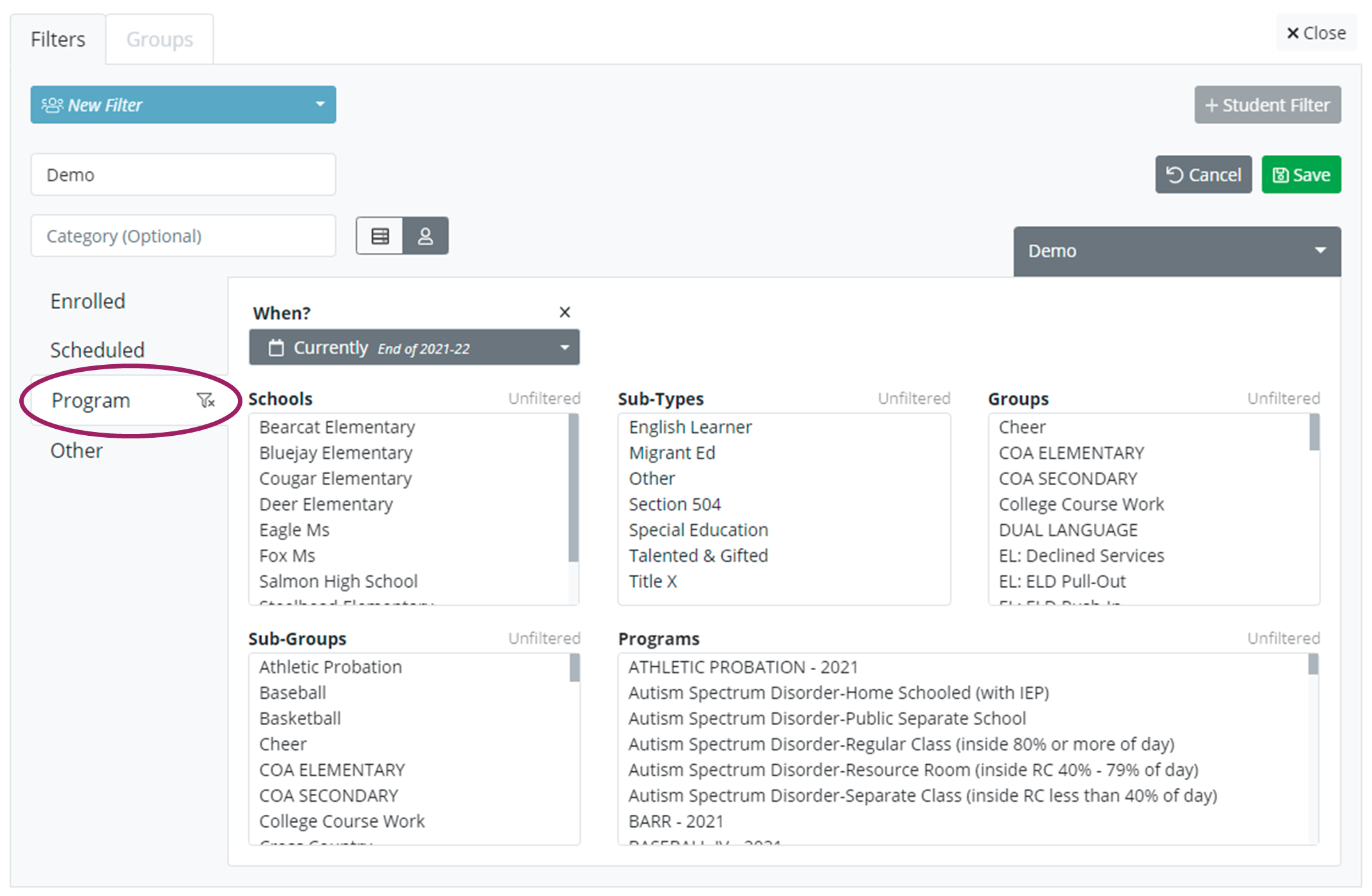 Pare down students by when they were enrolled, scheduled, or in a program. You can filter by more than one area, but it’s not necessary.