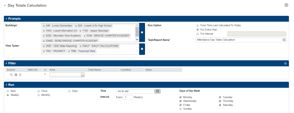 Please make sure you have your Day Totals Calculations (Attendance>All>Utilities>Day Totals Calculation) and Interval Totals Calculation (Attendance>Utilities>Interval Totals Calculation) set up and running for the current school year in eSchool, if they are not set up and running, we won’t receive your attendance.