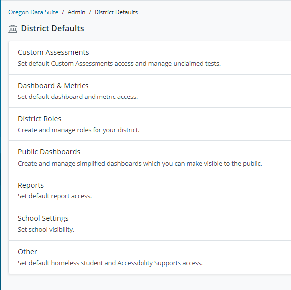 Go to Admin > District Defaults, and click on each category to check the current setup and access. Click on edit to make changes and updates.