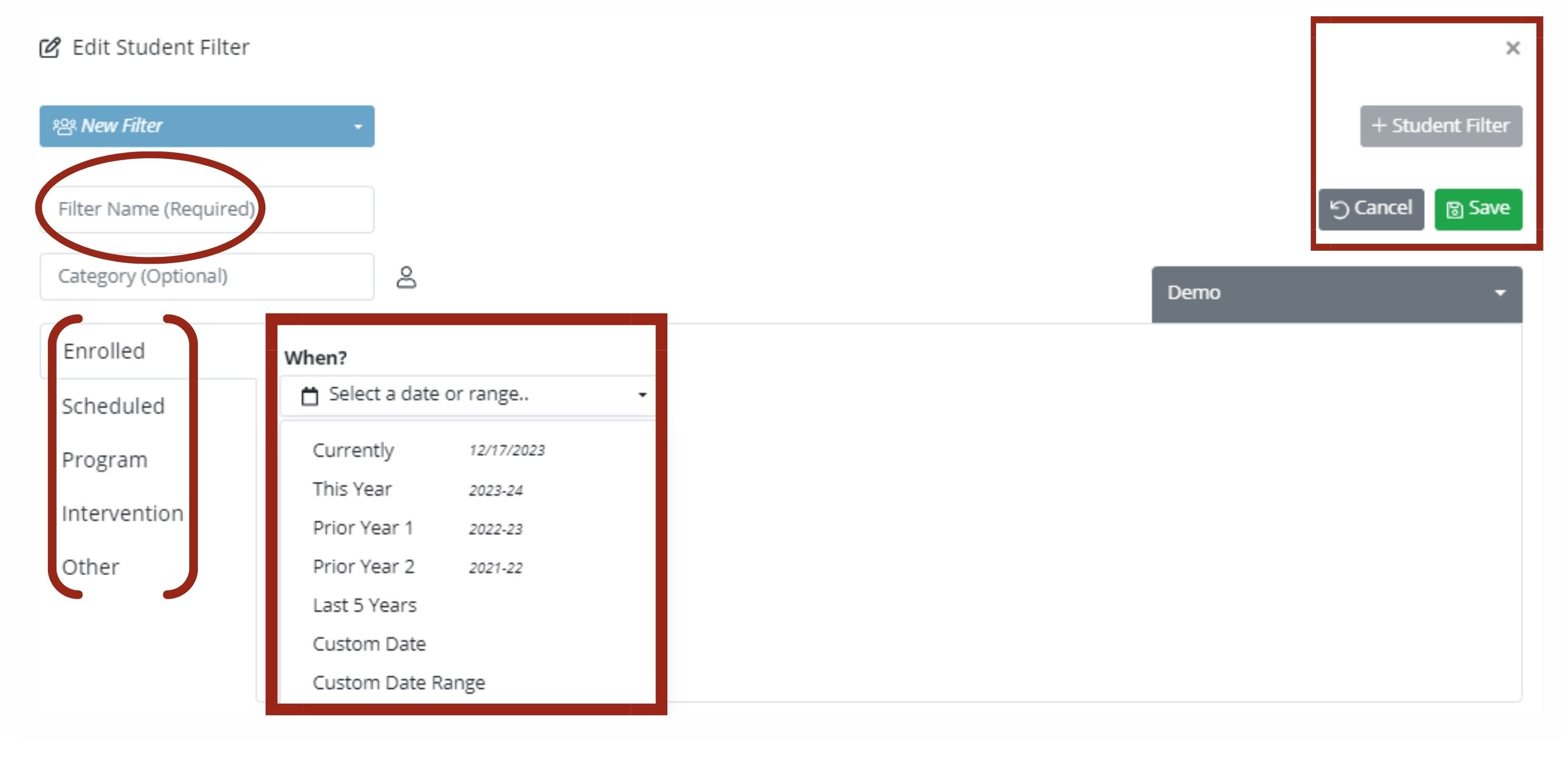 Give your new filter a name and category (optional). | Make your filter selections from Enrolled, Scheduled, Program, or Other. | Click the “Select a date or range” drop-down menu and choose your filter date. | Click ‘Save’ to save or click ‘Cancel' to cancel and then click '+ Student Filter' to add another filter or click 'X Close’ to close the filter box. |