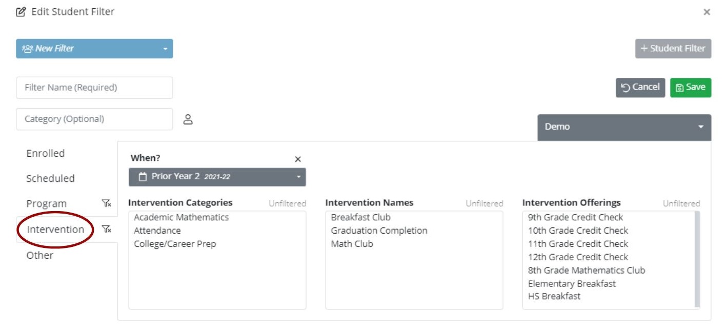 You can view current year interventions or adjust your When? to show prior years.