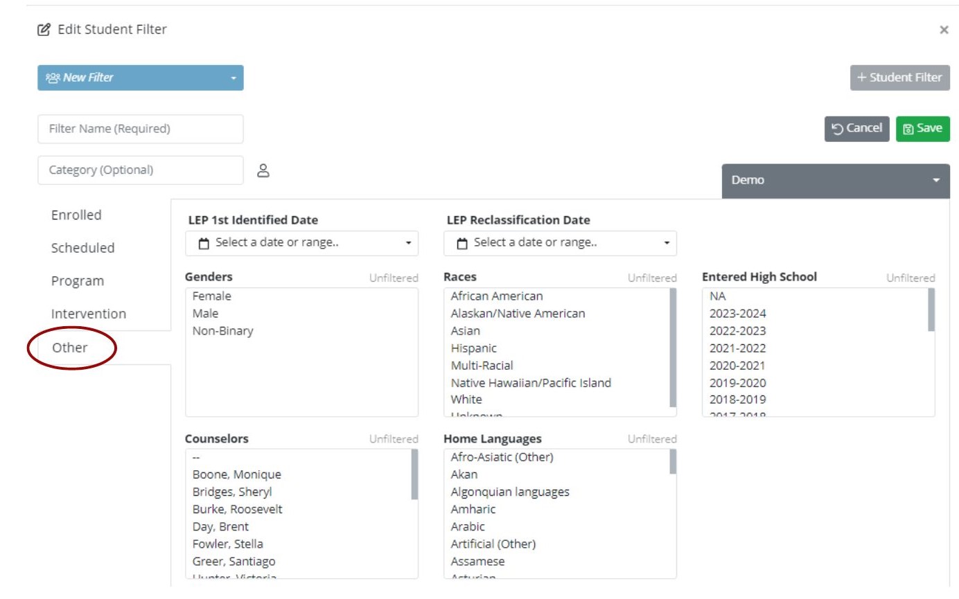 Click ‘Other’ to filter on LEP, Gender, Race, HS Entrance Year, or Counselors.