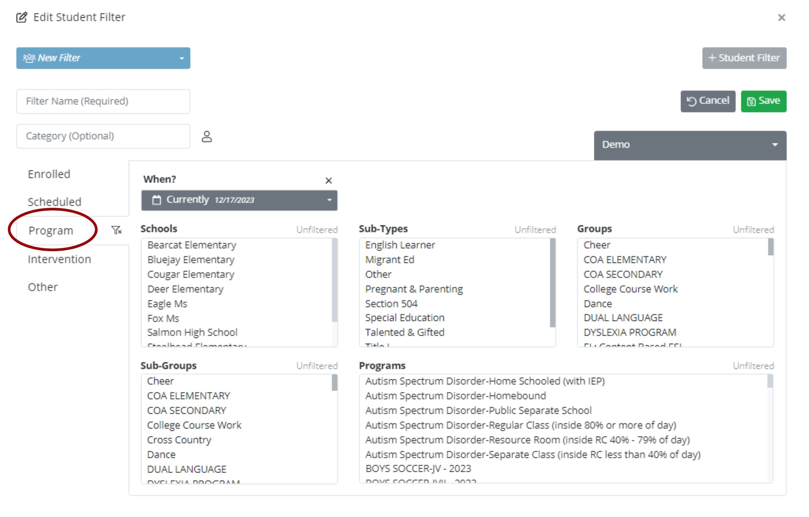 Pare down students by when they were enrolled, scheduled, or in a program. You can filter by more than one area, but it’s not necessary.