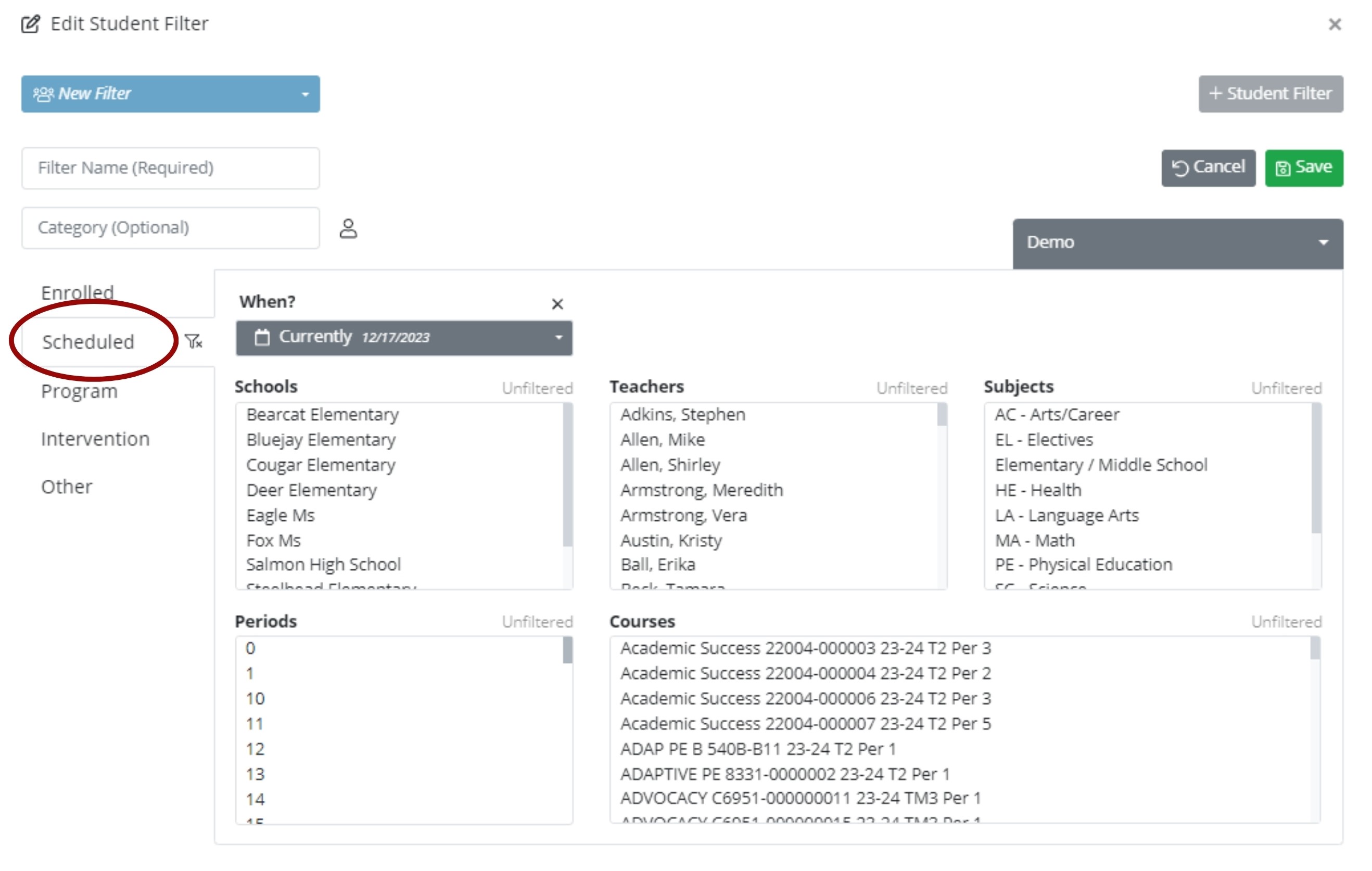 Click Scheduled to filter by Teacher, Course Subjects, Period, or Course.