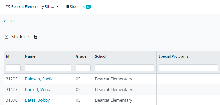 To view the students you have filtered on, click ‘Students’ next to the filter dropdown, this will create a list and a count of students. You still have the ability to view individual student data by clicking on the student name. The header rows are now all sortable.