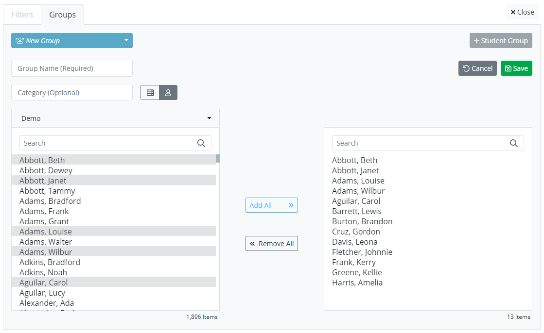 After entering the name of the group, select the students you want in the group by clicking on their name or searching for them in the ‘Search’ box. You can also add the entire group by selecting ‘Add All’ and remove everyone from the group by selecting ‘Remove All’. To remove a single student from the group, click on their name. Make sure to click ‘Save’ once you are done, ‘Cancel’ if you choose to clear your selections, ‘+Student Group’ to add another group, or ‘X Close’ to close the screen.