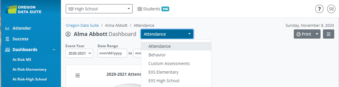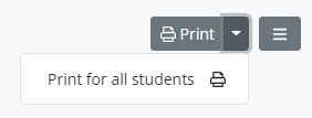 You will see a ‘Print’ icon in the upper left-hand corner of your screen, you can print for an individual student or ‘Print for all students that you have filtered on that are displaying on the left by clicking on the down arrow.
