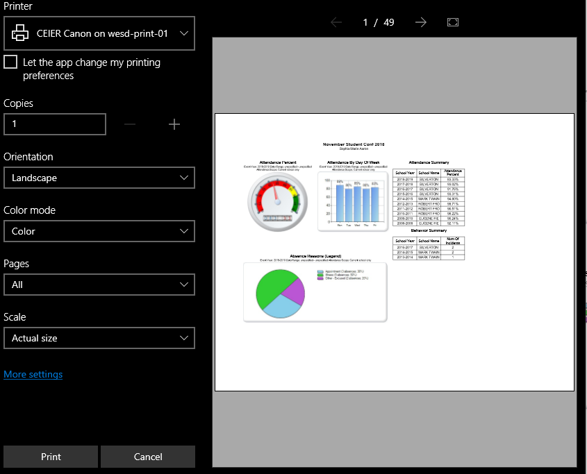 Select and run the first batch of students, click ‘Print’, save as ‘ Microsoft Print to PDF’ and select ‘Color’ or ‘Black & White’.