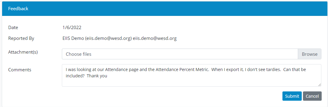 Be very specific about your feedback. Be sure to include the area of ODS you are in, the page, metric, or report your requesting a change to. You can also add an attachment if needed under ‘Attachment(s)’.