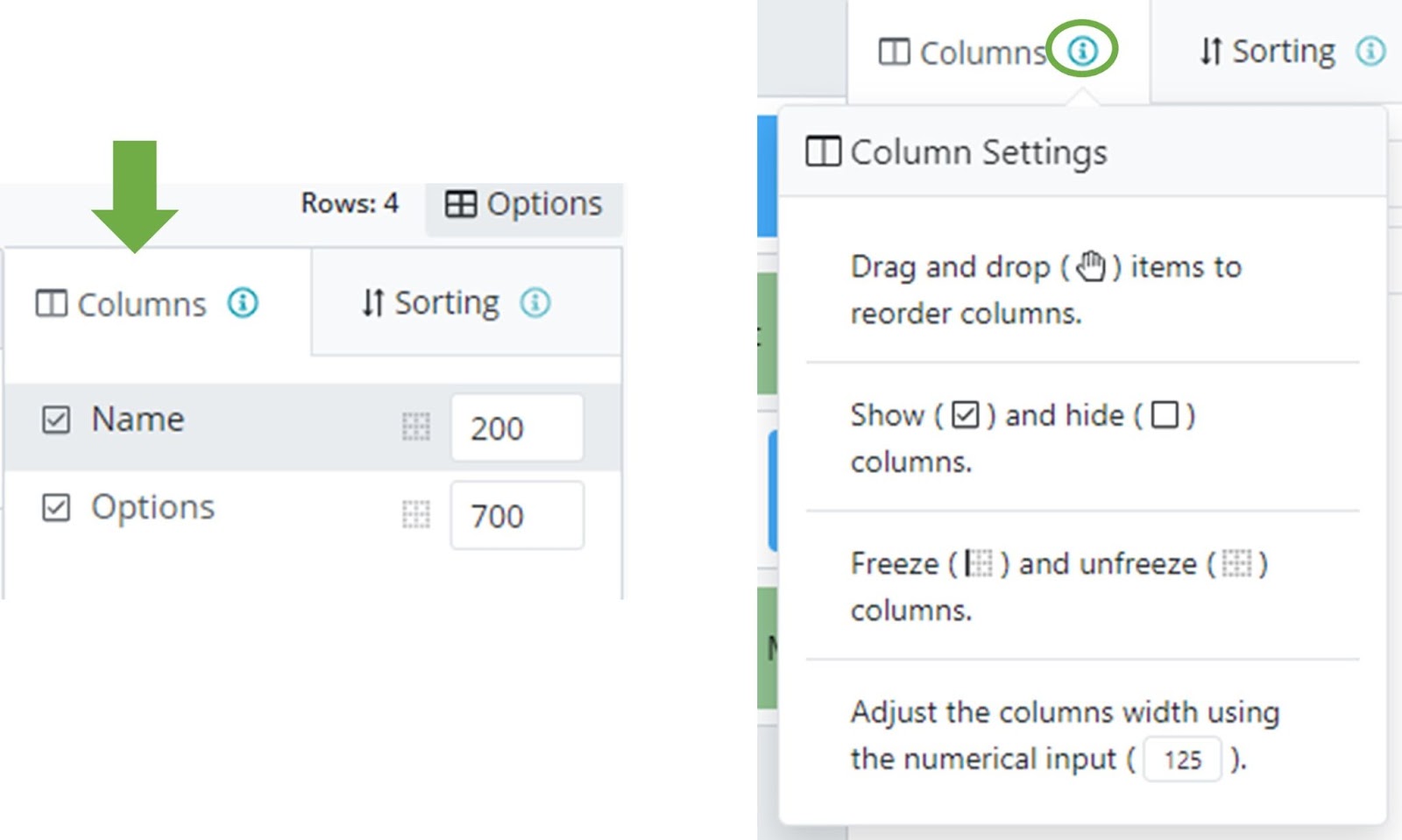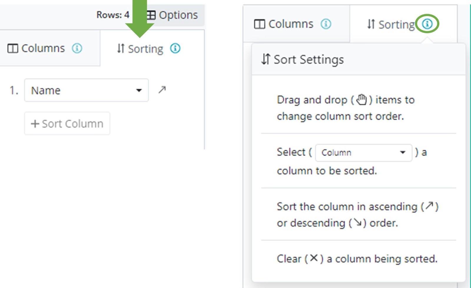 Columns Tab & Sorting Tab - click on the 🛈 to view settings for each