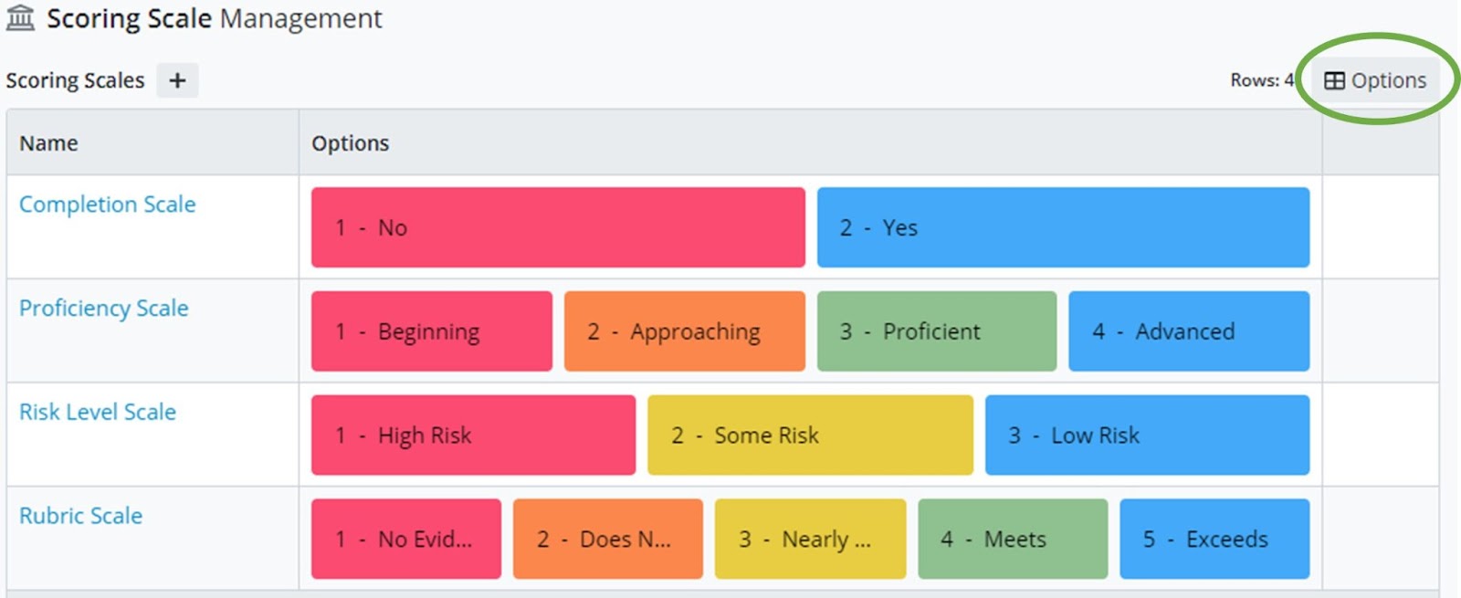 On Scoring Scale Management Page- Click the Options button to change/manage view